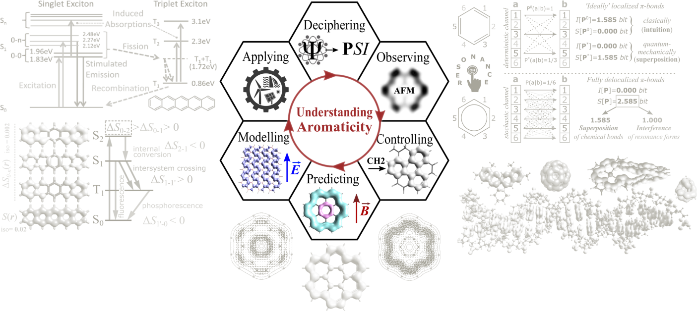 The core objective of the project is to decipher information contained in the ground-state wavefunctions of selected topologically diversified aromatic molecules and underlying their unique physico-chemical properties, and to progress toward understanding of the first-principle rules that determine evolution of this information in the lowest-lying excited states, under the influ-ence of external magnetic field as well as along chemical reactions. Verification of the project hy-potheses requires cross-disciplinary approaches, using knowledge from mathematics, information theory, theoretical and computational chemistry, and materials science, which makes it a truly excit-ing multidisciplinary challenge. The project will deliver an original method that holds the promise to open new directions in the field of molecular aromaticity as well as tools and research-based knowledge that could support the design and synthesis of novel conjugated materials for artificial photosynthesis and photoinduced electron transfer, molecular photovoltaics, porphyrinoids with resonance-driven optical-mechanistic switches for nanoscience, nanotechnology and biomedicine, and many others. Validation of the proposed maximum resonance-entropy principle for conjugated systems would have potentially far-reaching implications for predictive computational chemistry as well as organic chemistry in general. A tangible result of the research project will be new software, a website dedicated exclusively to the project outcomes, and scientific open-access papers pub-lished in reputed journals from the ISI Master Journal List.
